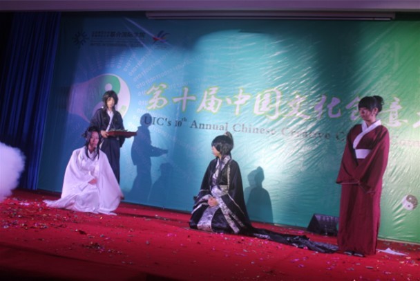是青春,就要秀!5月26日晚,UIC第十届中国文化创意大赛于B102高桌晚宴厅举行,同学们用饱满的热情和无限的创意,通过舞台表演和拍摄DV为全场观众带来了一场精彩的文化“秀”,共同奏响大赛十年和建校十年的动听乐章。吴清辉校长与其他嘉宾老师们一同来到大赛现场欣赏同学作品。吴校长在开幕致辞中说:“兴于诗,立于礼,成于乐。文化艺术修养是一个人成长、成才所应具备的重要素质。在今天这样的时代,培养深厚的文艺修养和创意才能,不仅是个人成才的重要因素,更是传承民族文化、传播中华智慧的关键力量。中国文化创意大赛已经陪伴我们走过了九个年头。今年,UIC迈入了十周年,而今天,同学们的精彩表演也将为UIC十周年献上一份特别的礼物。”