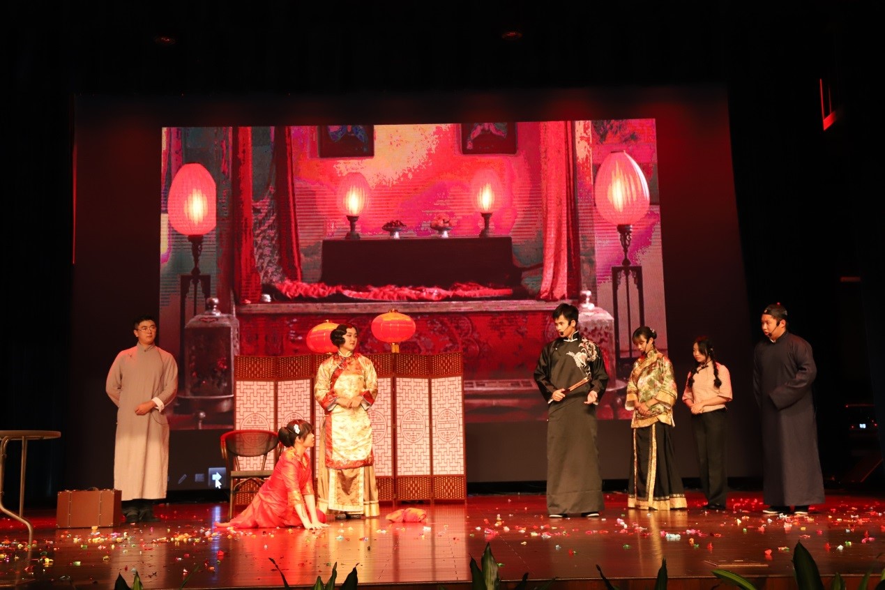 来自AE专业的“杜若社”带来作品《囚》。剧本改编自苏童的小说《妻妾成群》,讲述了民国初年女学生颂莲被卖到陈老爷家作四太太后,被金钱与地位诱惑,卷入府里太太们的争斗中,不幸落败发疯的故事。孙萍女士点评道,这个故事虽有张艺谋导演的影片《大红灯笼高高挂》珠玉在前,但学社成员通过对角色的重新解读,将原著浓缩成二十分钟左右的戏剧,情节极具张力和震撼力。“囚”这名字起得尤其好,既反映了剧中女性被困于封建制度下的凄惨命运,也揭示了人心在欲望牢笼里不得出路的可悲处境。