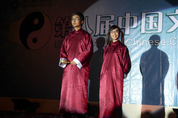 第二个现场节目《中华文化大串烧》以相声的形式,把古代教育和科举制度等大量传统文化知识串联起来,谈古论今,其中也不乏让大家捧腹的精辟吐槽。两位来自2012级市场营销专业的演员,语言幽默,台风喜感十足,表演十分到位。