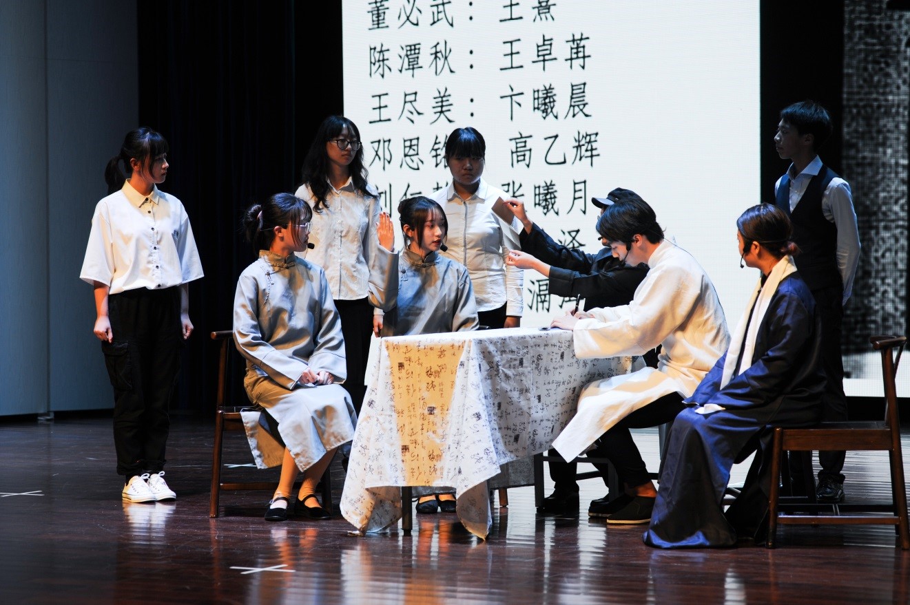 最后登场表演的是来自大一公共关系与广告专业的绝圣弃智学社,他们的作品《山雨欲来风满楼》再现了中国共产党波澜壮阔的建党历程,陈独秀、李大钊、毛泽东等密切合作,坚持不懈地开展马克思主义宣传及群众工作,最终克服种种困难险阻成立了中国共产党。星星之火,可以燎原,回顾一百年前的这段历史,依然令人心潮澎湃。评委王小勤女士表示,面对如此精彩的作品,任何点评都将会是苍白的,而今年恰逢是五四运动一百周年,同学们生动的演绎让大家深刻地感受到,中国特色社会主义道路依然是最正确的选择,是历史的选择、人民的选择,同学们对建党历程的演绎充分地体现了习近平主席所说的“四个自信”。最后王小勤女士更期盼UIC能在以后继续用自己独特的方式去展示、传承优秀的中华文化。