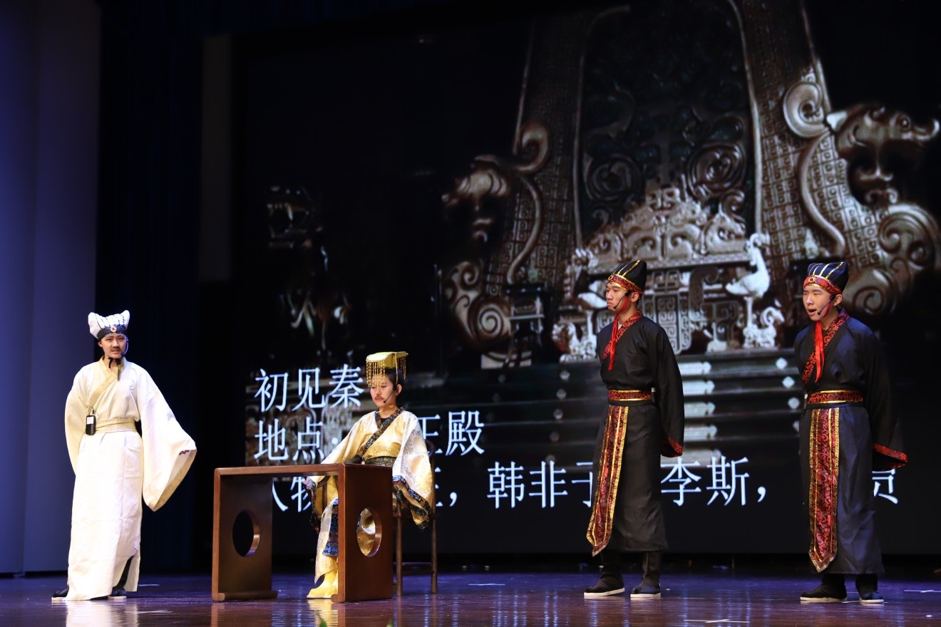 第五个表演的是来自大一财务管理专业的洪兴学社,他们的作品《殉法者》再现了韩非子在秦寻求变法理想,最终以身殉法的悲壮经历,战国形势的波谲云诡、变法志士与保守势力之间的博弈都被他们生动地呈现了出来。评委刘振环教授表示为同学们的表演天分感到惊讶,饰演韩非、姚贾、李斯以及秦王等同学的表演入情、入理、入戏,整个作品矛盾激烈,十分到位,并说“专业、专注是现代社会最重要的两个品质”,同学们今日在舞台上的专注,一定会成就日后在生活工作上的专业。