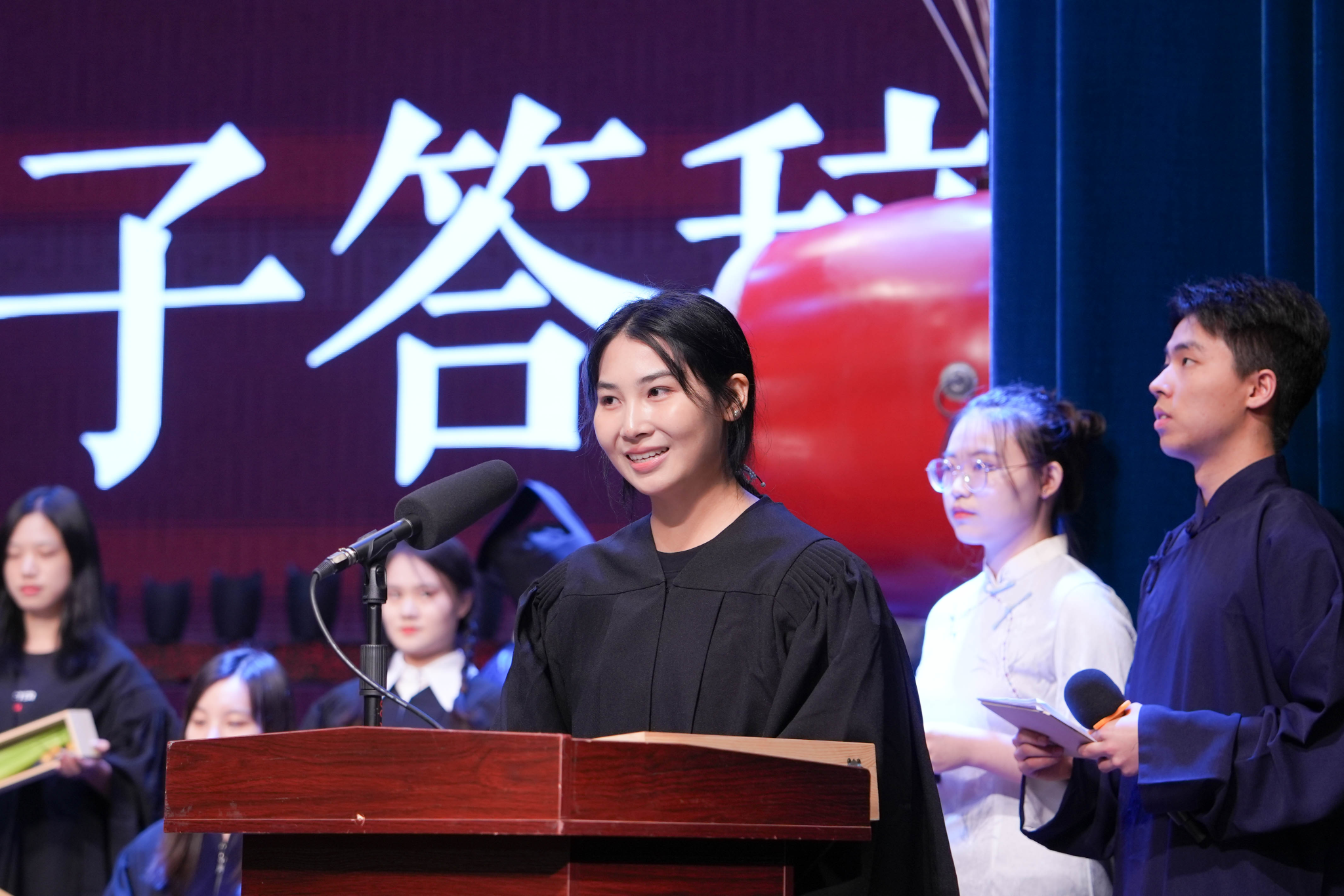 随后,由台上行礼学生带领全体学子齐声朗读《大学》选段,时刻铭记“正心,诚意,格物,致知”的大学之道。整个仪式充满了庄重且富有仪式感的氛围。