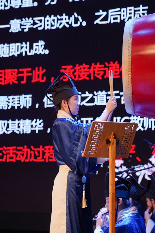 随后,师长以龙眼、芹菜、葱为回礼送予学子。磬鼓鸣响,学子行礼,师长退台,敬师礼礼成。