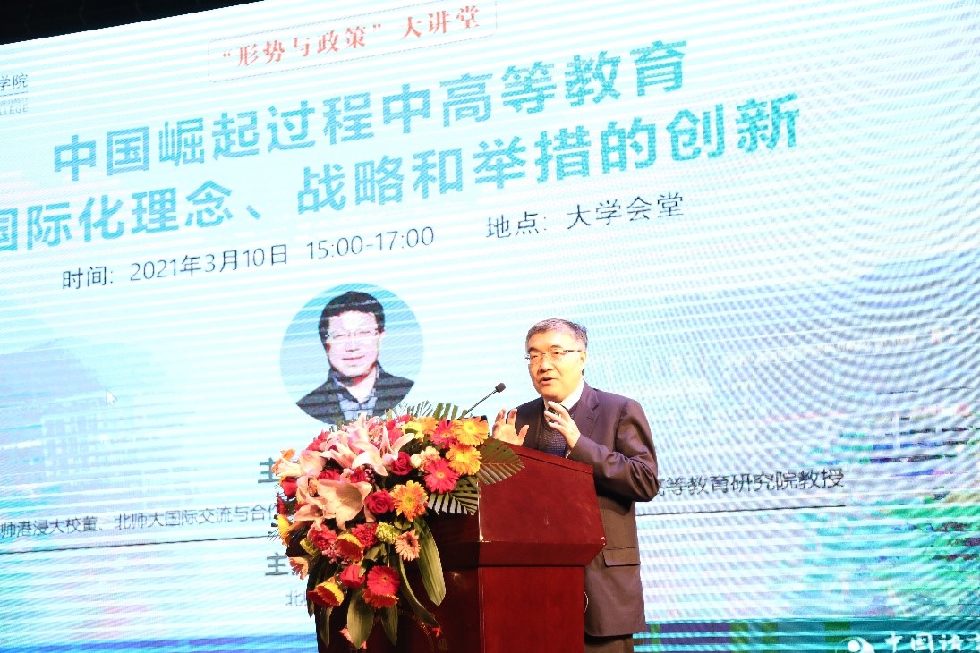 2021年3月10日下午,本学期的“形势与政策”系列讲座顺利举行,主会场——大学会堂座无虚席。北京师范大学高等教育研究院洪成文教授应邀担任主讲人,做了一场以“中国崛起过程中高等教育国际化理念、战略和举措的创新”的精彩演讲。本次讲座由北师港浸大教务长李建会教授主持,中国语言文化中心主任伍鸿宇教授出席。