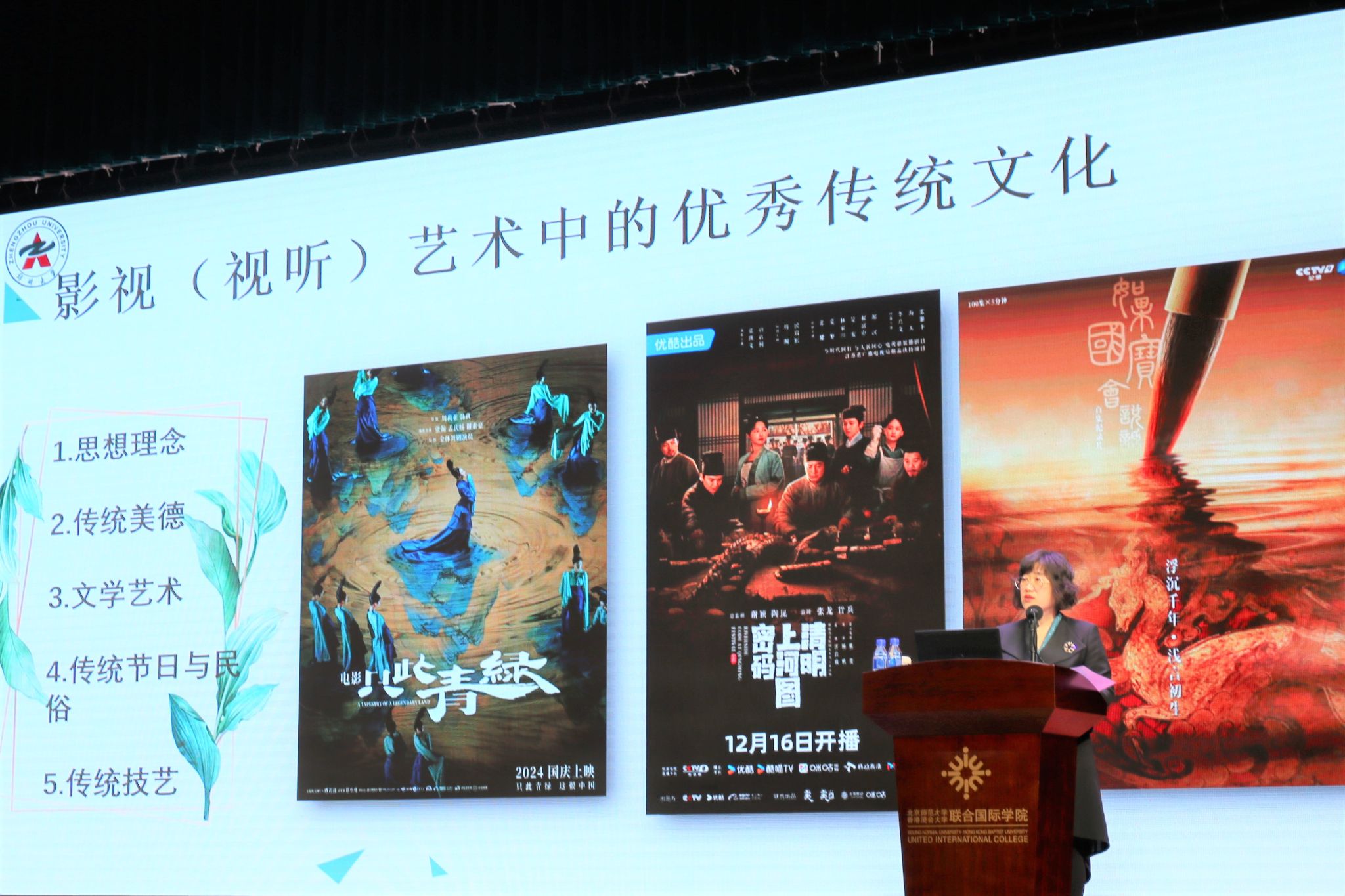 陈教授的讲座是一次传统和现代的“碰撞”,充分体现了习近平总书记“两个结合”的精神。她首先提纲挈领地介绍了各个时期中国的领导核心对优秀传统文化政策的指示,尤其强调了十八大以来党和国家对优秀传统文化的重视,并以《只此青绿》等影视作品为例,指出影视作品是优秀传统文化的重要载体,可以生动地展现传统美德、传统节日与民俗等方方面面的内容。