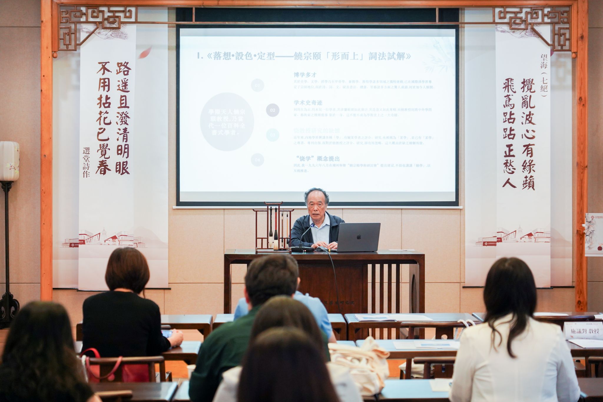 講座尾聲,施教授呈現饒公晚年禪意盎然之創作。其以荷葉荷田、雲煙花外為意象之小令,熔儒釋之學與清雅意趣於一爐,既為心跡之流露,亦臻化境之圓融。